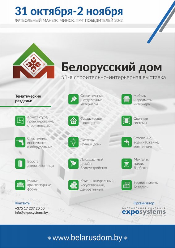 Сотни инноваций из сферы строительства, архитектуры, ремонта, интерьера и благоустройства домов, новинки в сфере отделочных материалов. По традиции в центре Минска свои экспозиции развернут компании строительного сектора: производители и поставщики строительных и отделочных материалов, студии архитектуры, интерьера и дизайна, проектные бюро. Под куполом Футбольного манежа представители Беларуси, России, Украины, Чехии и других стран поделятся своими достижениями и секретами в сфере строительства и ремонта. «Белорусский дом» - это профессиональная площадка для взаимодействия специалистов с партнерами, заказчиками и конечными потребителями.