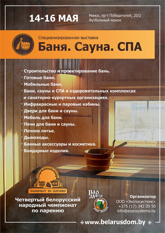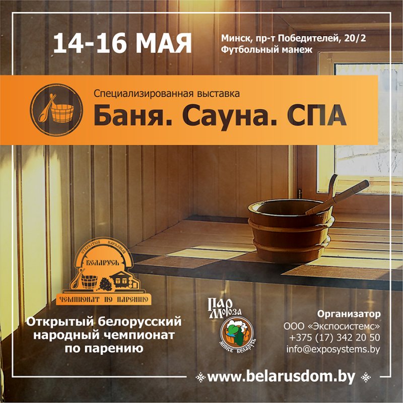 В Футбольном манеже с 14-16 мая 2020 года компании из Беларуси, России, Украины и других стран представят широкий ассортимент товаров и услуг для бани, сауны, СПА. Готовые строения будут смонтированы и выставлены как внутри Футбольного манежа, так и на уличной площадке. Посетители получат возможность ознакомиться и сопоставить цены, качество, получить профессиональные консультации, а также совершить покупки на выгодных условиях.
