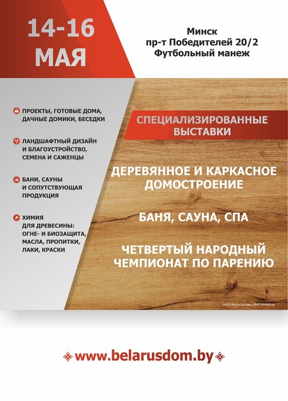 В Футбольном манеже с 14-16 мая пройдет международная специализированная выставка «Деревянное и каркасное домостроение. Баня», которая на протяжении многих лет демонстрирует в центре белорусской столицы широкий ассортимент элитных и бюджетных домов, срубов, бань, беседок, а также предложения от компаний по ландшафтному дизайну и благоустройству зон отдыха и барбекю.