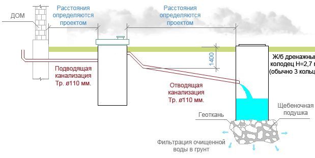 Накопительная система – наиболее простая и дешёвая система, позволяющая легко решить проблему удаления стоков. Её монтаж выглядит так: