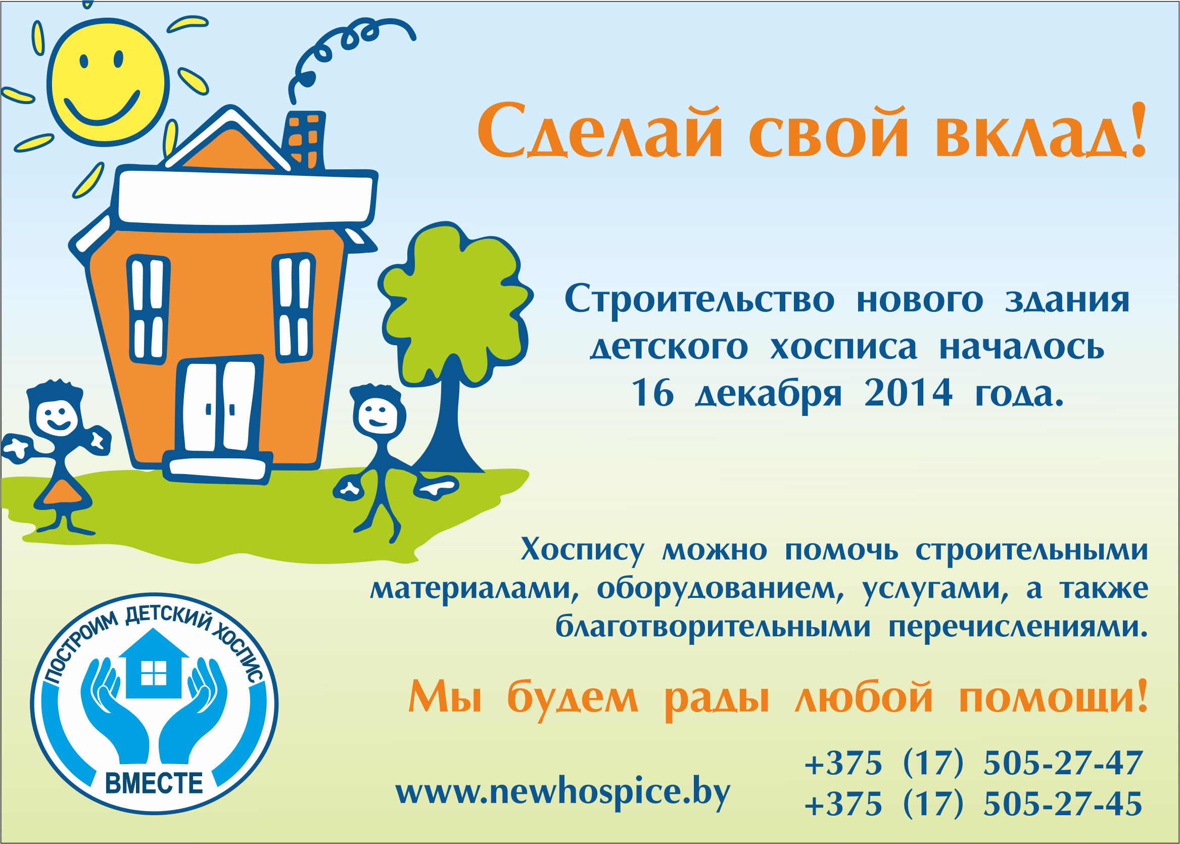Общественная благотворительная организация «Белорусский детский хоспис» на протяжении 20 лет бесплатно оказывающая медицинскую и социально-психологическую помощь безнадежно больным детям и их семьям в Республике Беларусь, сейчас строит новое здание в д. Боровляны под Минском.