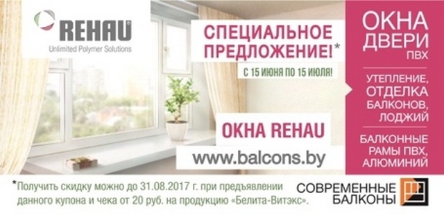 В Беларуси началось «Лето перемен!» Только с 15 июня по 15 июля 2017 года каждый, кто совершит покупку в магазине косметики и парфюмерии «Белита-Витэкс» (Могилёв) на сумму 20 рублей и выше, получит 3% скидку на окна REHAU в салоне компании «Современные балконы», а также 1 год дополнительной гарантии на конструкции.