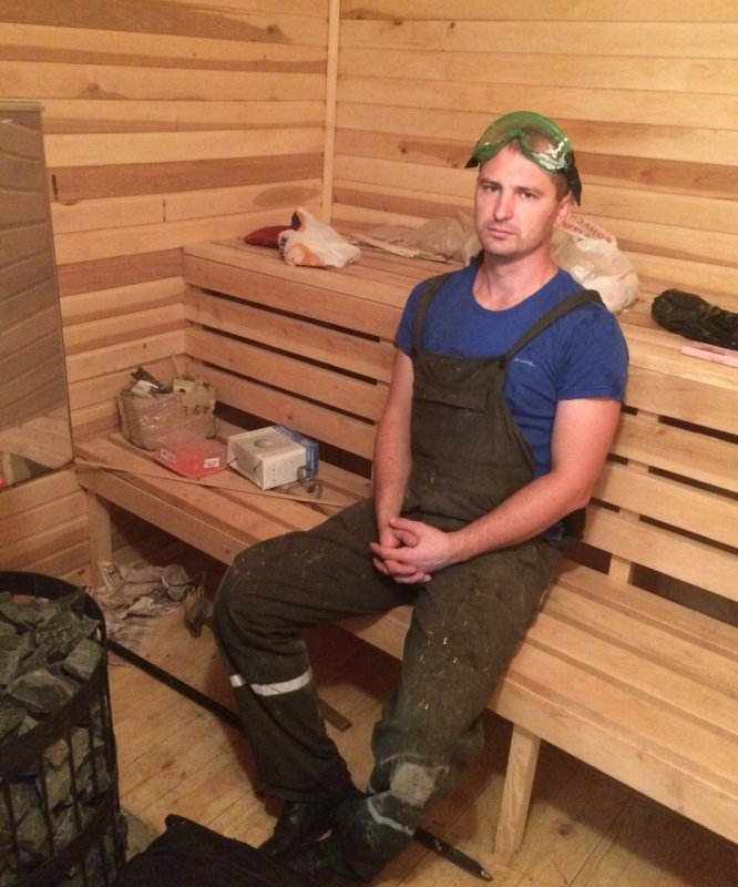 Электрика. Когда я принес провод для подключения бани и светильник для проверки работоспособности розеток, у Олега подозрительно забегали глазки, руки начали шарить по карманам. Предчувствия оправдались: в парилке и душевой свет не работал, одна розетка почему-то работала только при включенном свете в предбаннике, вторая не работала совсем. Олег, потупив глазки, робко признался, что в электрике ни он, ни его верные оруженосцы не сильны, делали по наитию на «авось» — пришлось переделывать.