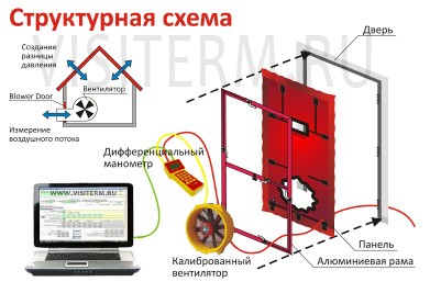 - Съемная дверная панель (ткань или пластик) с отверстием для вентилятора, она устанавливается в проем входной двери тестируемого помещения.