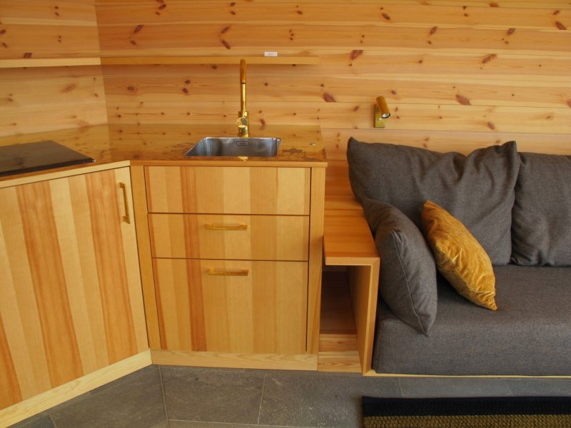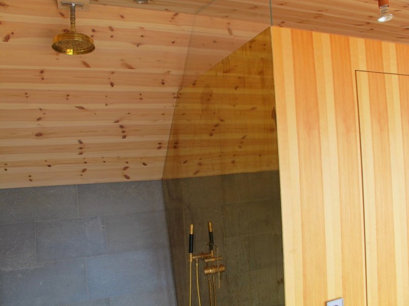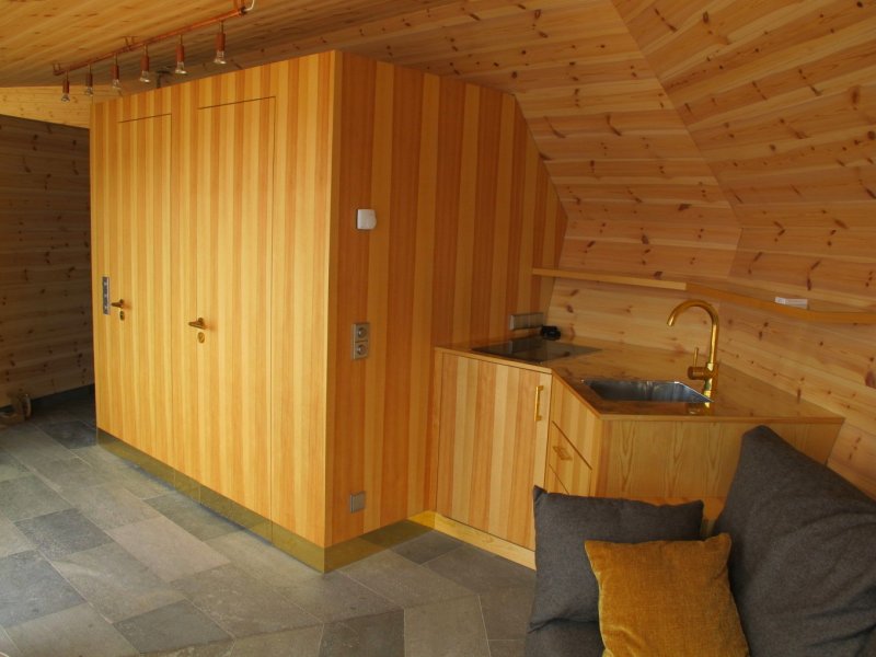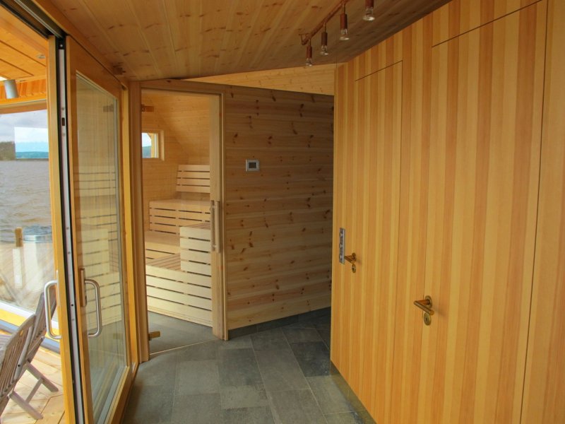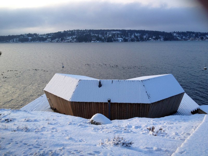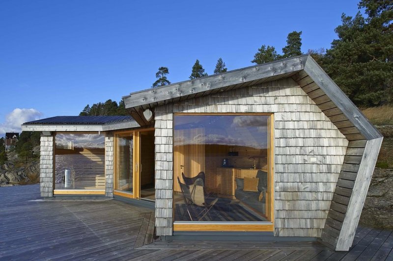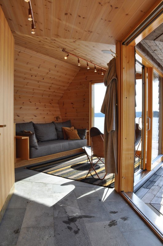 Постройка имеет форму самолёта, что обусловлено особенностями причала. Крыша, выполненная из сосны, превращается в фасад, в то время как противоположная сторона постройки выполнена в манере, которая часто используется в облицовке старых деревянных церквей. На западной стороне находится сауна, а на востоке расположена комната отдыха. Центральная часть вмещает помещение для хранения, а также душ и туалет. Интерьер дополняют сделанные на заказ мини-кухня и диван, латунные элементы в душе и пол из натурального камня.